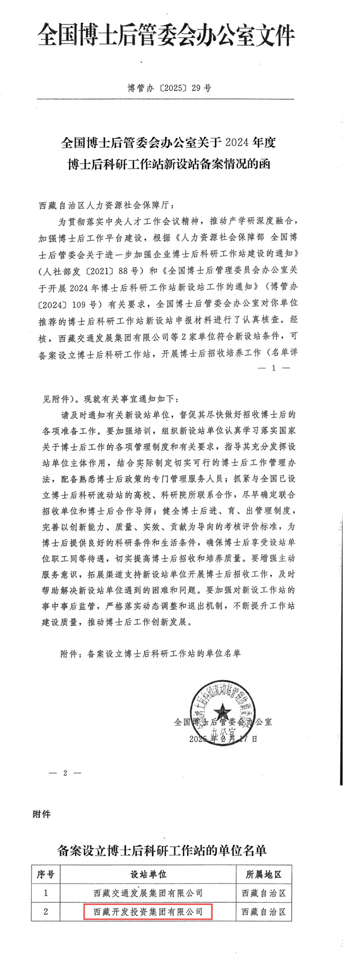 近日,全國博士后管委會辦公室公布了《關(guān)于2024年度博士后科研工作站新設(shè)站備案情況的函》,西藏開投集團(tuán)成功獲批設(shè)立博士后科研工作站,標(biāo)志著集團(tuán)在科技創(chuàng)新和人才培養(yǎng)方面邁上新臺階,將為推進(jìn)集團(tuán)清潔能源產(chǎn)業(yè)高質(zhì)量發(fā)展注入強(qiáng)勁動力。