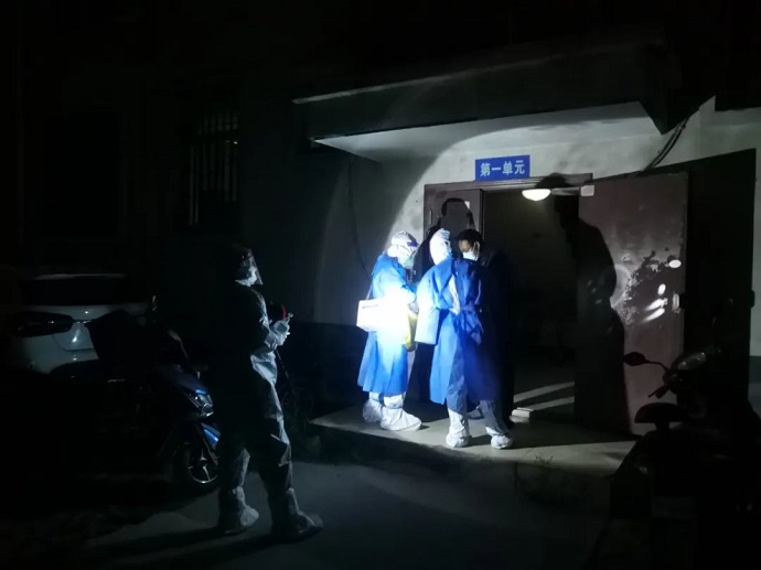 在做好防護(hù)準(zhǔn)備后,扯起嗓門開始耐心的給即將入睡的百姓做起動(dòng)員。在疫情期間,經(jīng)歷了漫長(zhǎng)的等待,蝸居在家的市民大多習(xí)慣了早晚無序的核酸檢測(cè),但還有不少以身體不適、經(jīng)不起“磨煉”等理由進(jìn)行躲避、抗拒,隊(duì)員們不厭其煩,只能冒著風(fēng)險(xiǎn)逐戶登門做思想工作。舉燈踱步、排門逐戶做完檢測(cè)一眨眼三個(gè)多小時(shí)過去了,再做好試管封裝,數(shù)據(jù)統(tǒng)計(jì)、校對(duì)后已至子夜后半段,深秋微涼的晚風(fēng)已被隊(duì)員的熱情牢牢抵御在防護(hù)服之外。
