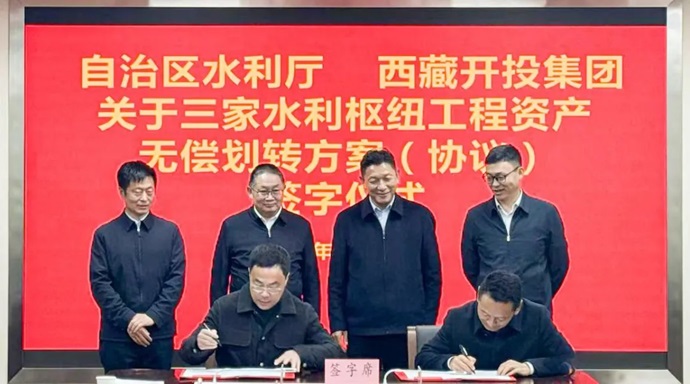12月11日,自治區(qū)水利廳與西藏開投集團(tuán)在拉薩簽署旁多、滿拉、拉洛三大水利樞紐工程資產(chǎn)無償劃轉(zhuǎn)協(xié)議,標(biāo)志著西藏國有企業(yè)改革邁出堅實(shí)步伐。自治區(qū)水利廳黨組副書記、廳長和忠華,區(qū)政府國資委黨委委員、副主任于雷,西藏開投集團(tuán)黨委書記、董事長祁騰武出席簽字儀式并講話。自治區(qū)水利廳黨組成員、副廳長趙輝與西藏開投集團(tuán)黨委委員、副總經(jīng)理尼瑪代表雙方簽署協(xié)議。集團(tuán)領(lǐng)導(dǎo)羅布次仁、陳焱罡出席儀式。