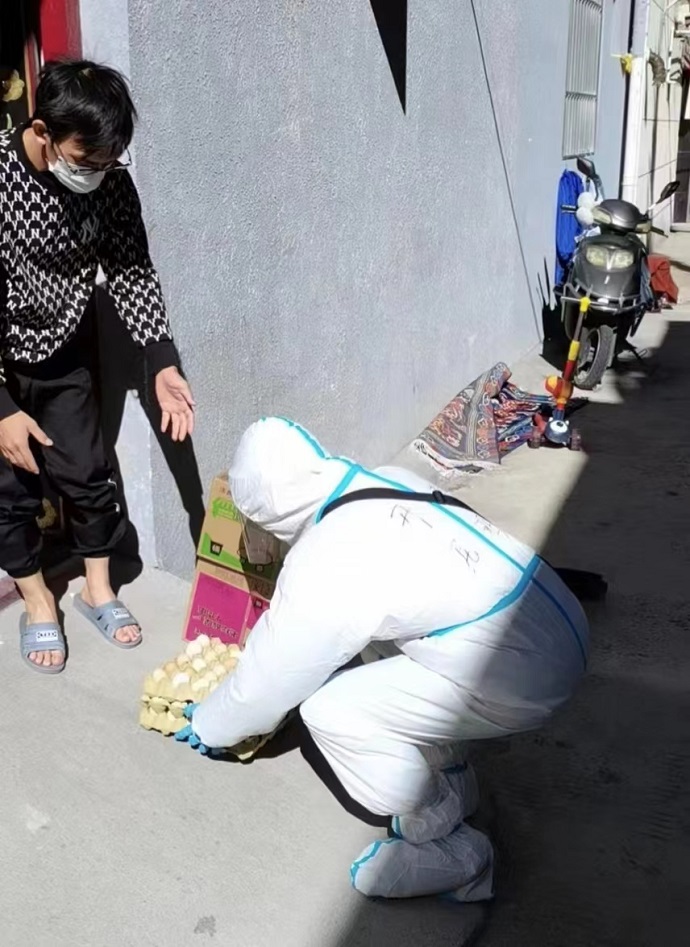 在下沉服務中,尼瑪?shù)弥鐓^(qū)里一位名為次仁卓瑪?shù)呐⑸顕乐乩щy,立刻前往幫助。據(jù)了解,次仁卓瑪來自林芝市工布江達縣,因疫情暫時滯留在拉薩。她的母親和姑姑因病在拉薩市人民醫(yī)院就醫(yī),年邁的奶奶隨行照顧。父親和哥哥也去了方艙,留下她跟一位親戚居家隔離。這些日子,靠著政府免費發(fā)放的大米、糌粑維持生活。生活的窘迫,讓女孩幾度哽咽。尼瑪安慰鼓勵道:“孩子,困難是暫時的,你作為家里唯一的大學生,不能被打倒,你要堅強起來。我們是人民政府派來的志愿者,我們會想辦法解決困難,孩子要笑起來,相信勝利很快就能到來!”隨后,尼瑪和楊俊生為其愛心捐款1000元,劉青松為其送去蔬菜、雞蛋等生活物資。寬心的話語、暖心的行動,讓這個堅強的女孩,露出了格?;ò銧N爛的笑容。