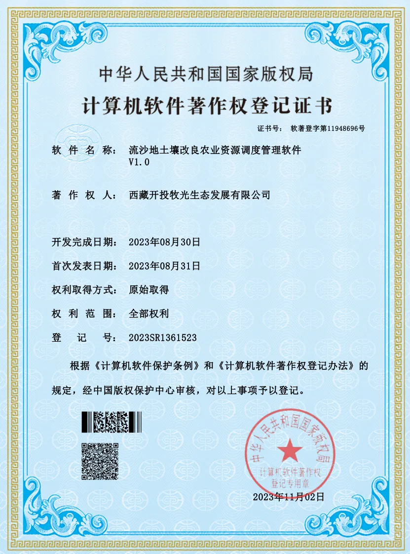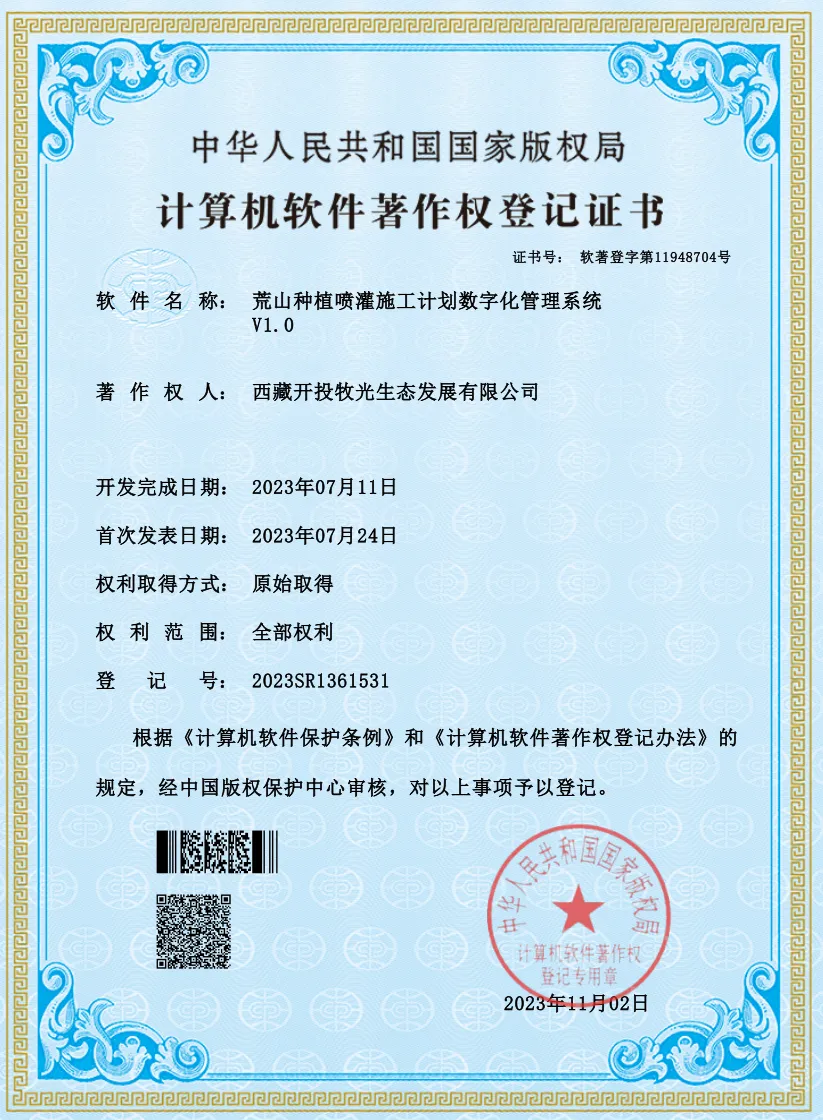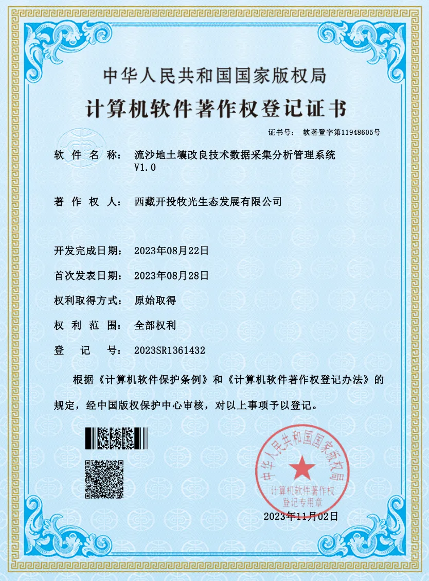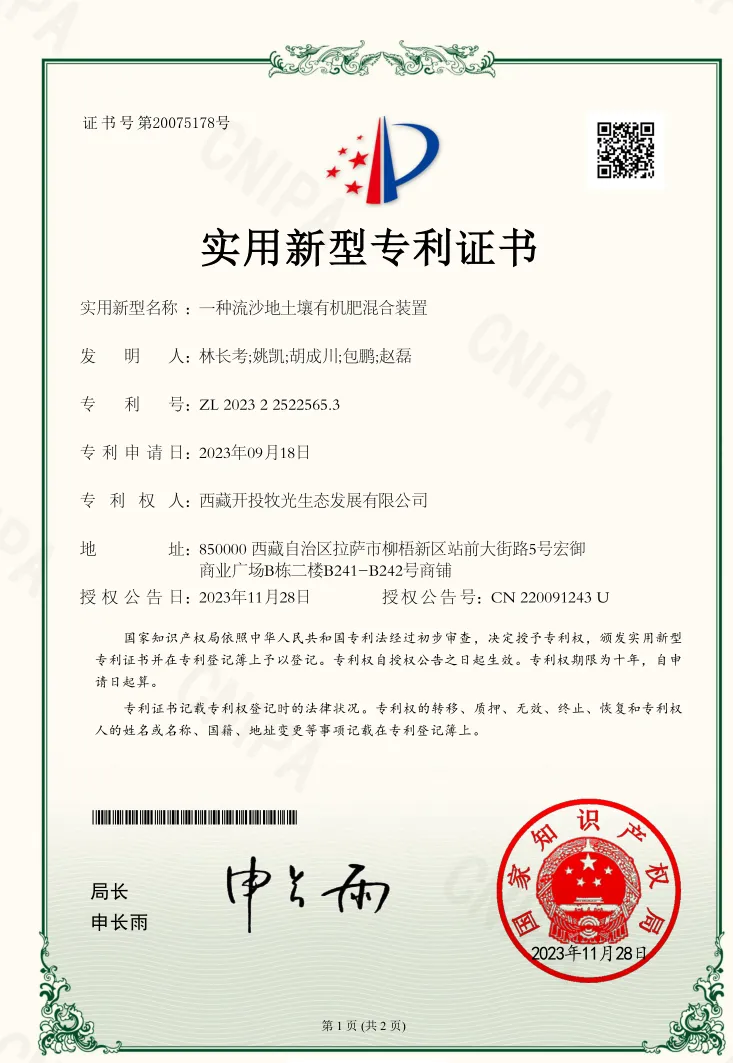 經(jīng)過一年多的摸索,西藏開投在拉薩南北山綠化工程項目形成了豐富的技術(shù)成果,于近日成功申報獲取了1項實用新型專利和5項計算機軟件著作權(quán)。分別是《一種流沙地土壤有機肥混合裝置》實用新型專利和《土壤改良種植技術(shù)項目實施進度跟蹤管理系統(tǒng)V1.0》《流沙地土壤改良技術(shù)數(shù)據(jù)采集分析管理系統(tǒng)V1.0》《流沙地土壤改良農(nóng)業(yè)資源調(diào)度管理軟件V1.0》《荒山種植噴灌施工計劃數(shù)字化管理系統(tǒng)V1.0》《荒山種植噴灌施工智能化控制管理軟件V1.0》計算機軟件著作權(quán)。