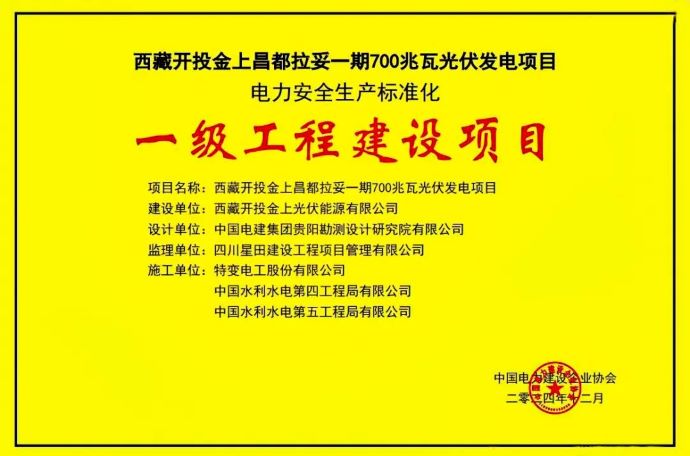西藏開投金上昌都拉妥一期700兆瓦光伏項目于12月順利通過電力建設(shè)工程安全生產(chǎn)標(biāo)準(zhǔn)化一級評審,榮獲中國電力建設(shè)企業(yè)協(xié)會頒發(fā)的“電力安全生產(chǎn)標(biāo)準(zhǔn)化一級工程建設(shè)項目”榮譽。