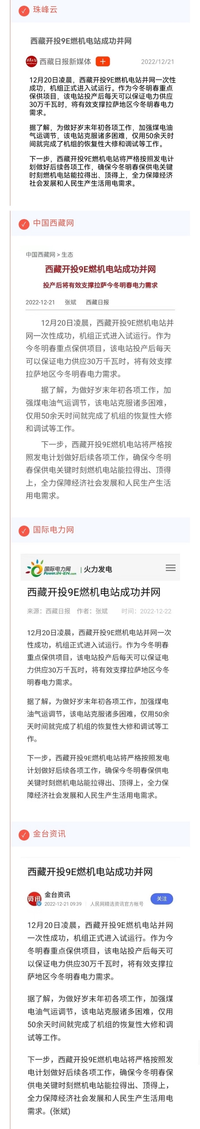 西藏衛(wèi)視(西藏新聞聯(lián)播)、珠峰云、中國(guó)西藏網(wǎng)、國(guó)際電力網(wǎng)及金臺(tái)資訊等媒體報(bào)道西藏開(kāi)投9E燃機(jī)電站成功并網(wǎng)