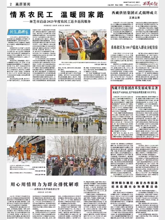編者按:12月9日,西藏日報第二版高原要聞欄目報道了《西藏開投集團改革發(fā)展成果顯著建成投產(chǎn)9座電站,投產(chǎn)總裝機容量突破100萬千瓦》文章。全文如下: