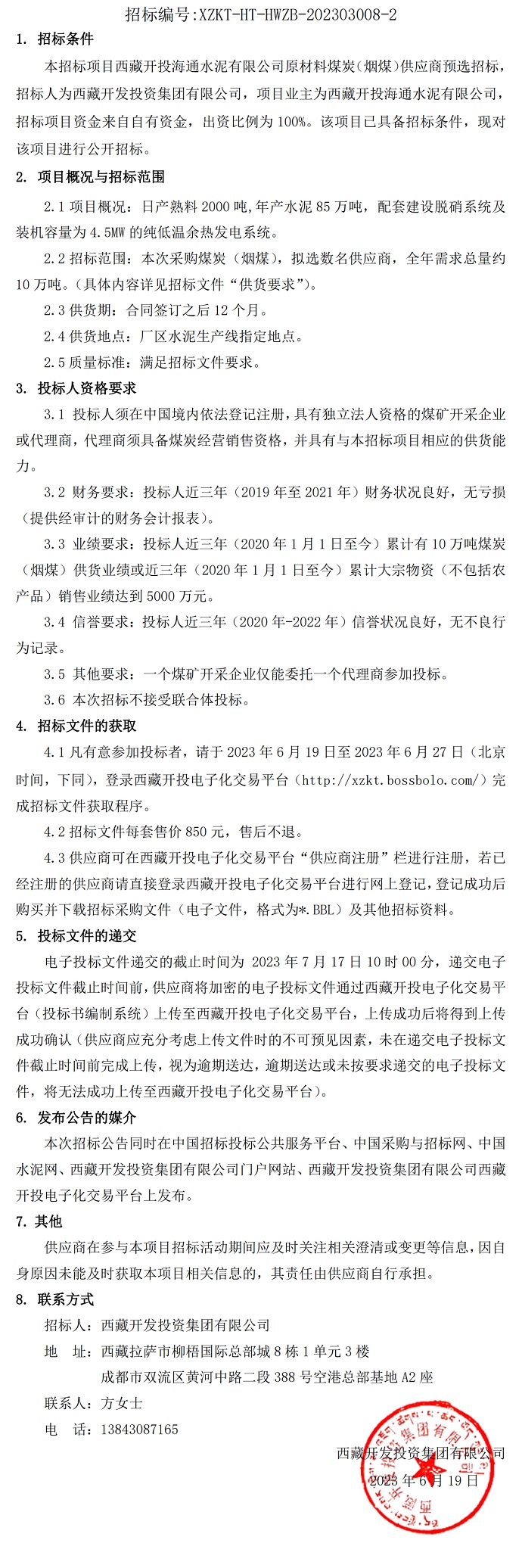 西藏開投海通水泥有限公司原材料煤炭(煙煤)供應(yīng)商預(yù)選招標公告(二次)