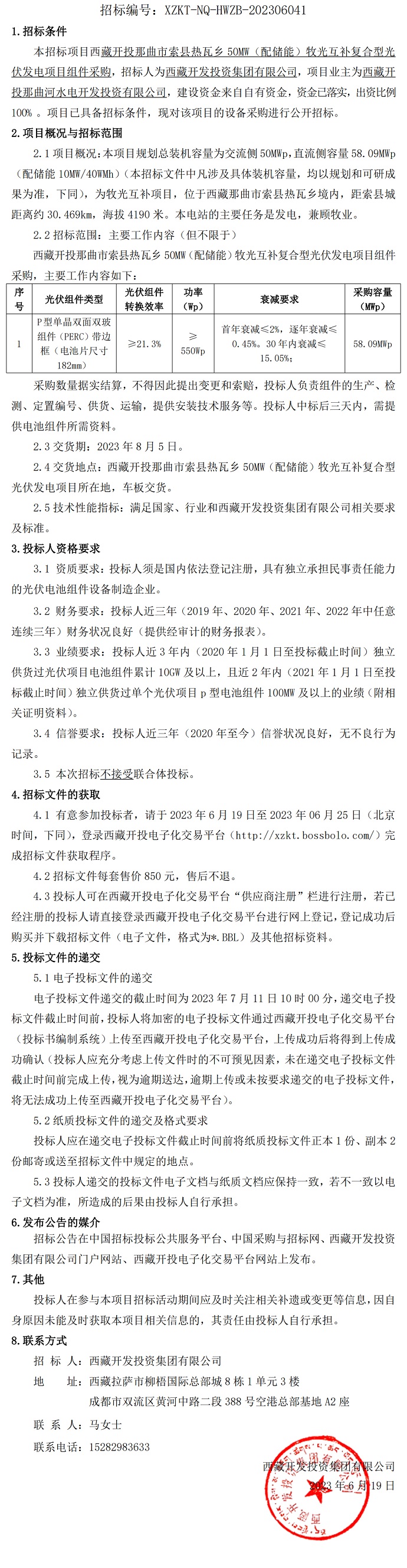 西藏開投那曲市索縣熱瓦鄉(xiāng)50MW(配儲(chǔ)能)牧光互補(bǔ)復(fù)合型光伏發(fā)電項(xiàng)目光伏組件采購招標(biāo)公告